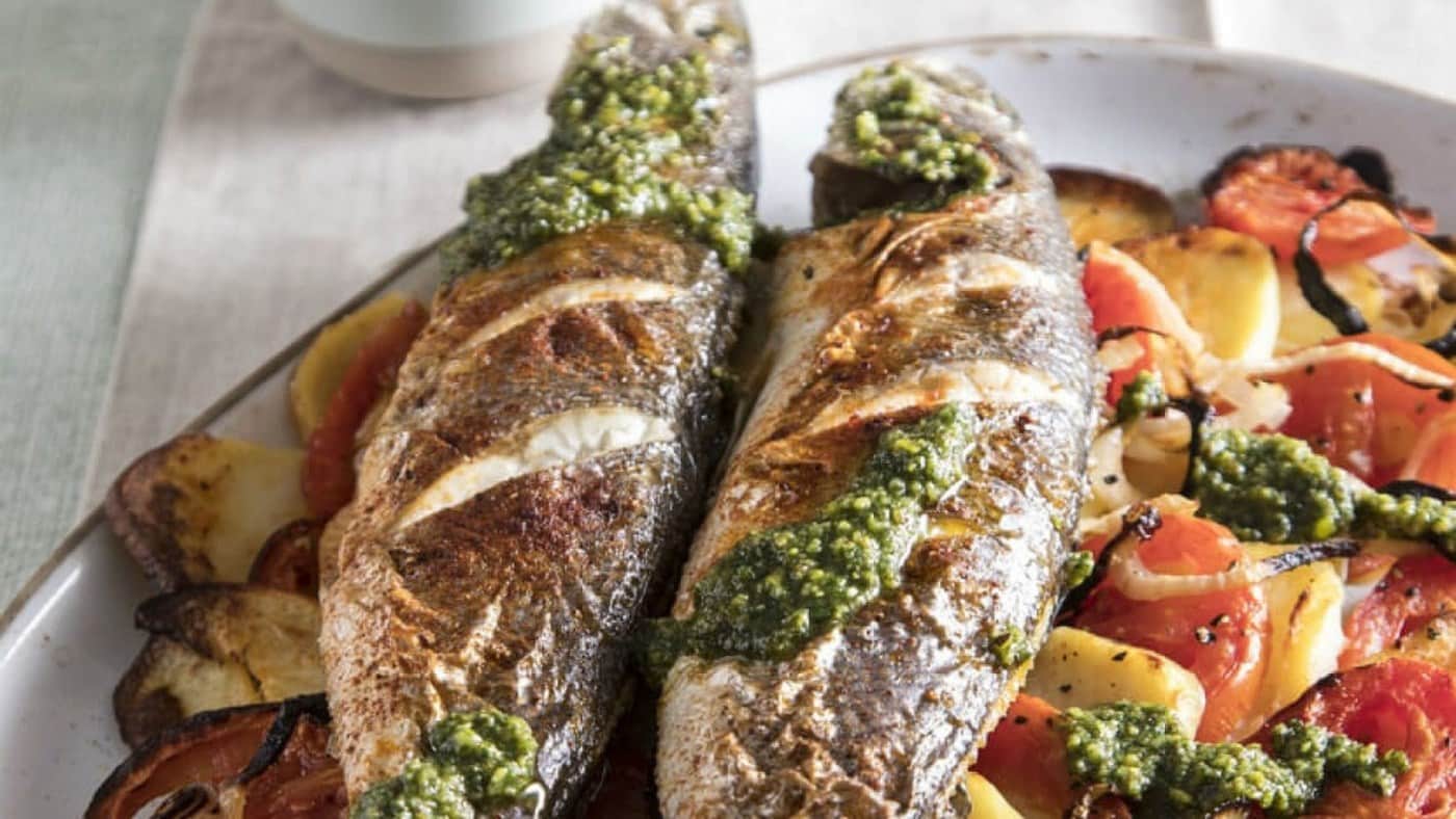 9. מסדרים שכבת ירקות בכל צלחת הגשה מניחים עליה דג ומפזרים עליו תלוליות של פסטו נענע מגישים מייד לצד פלחי לימונים אפויים.
