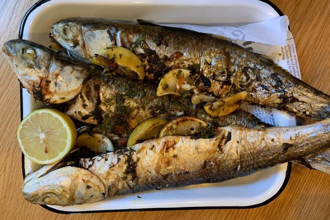 5. את הלימון פורסים ומניחים על כל דג 2-3 פרוסות.